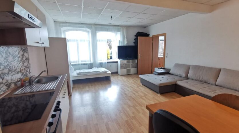 Es stehen dem Mieter ein Wohn-/Schlafzimmer, ein Bad sowie eine Küche mit allen Ober- und Unterschränken zur Verfügung.