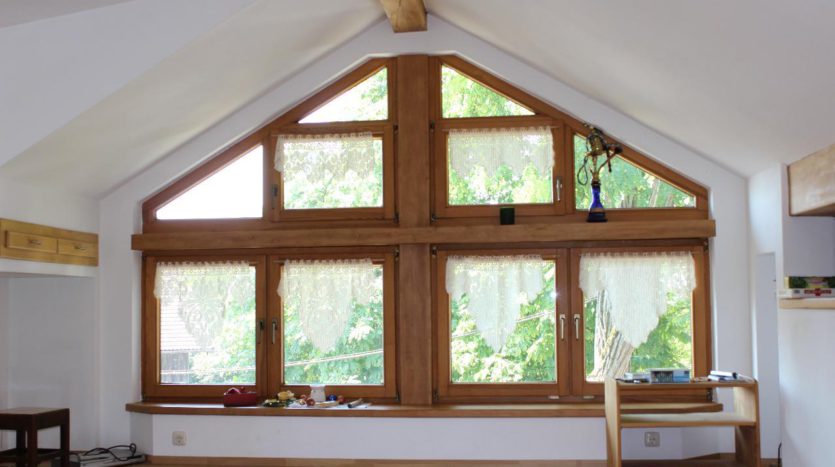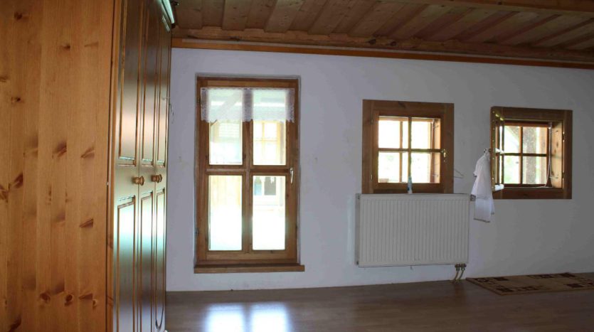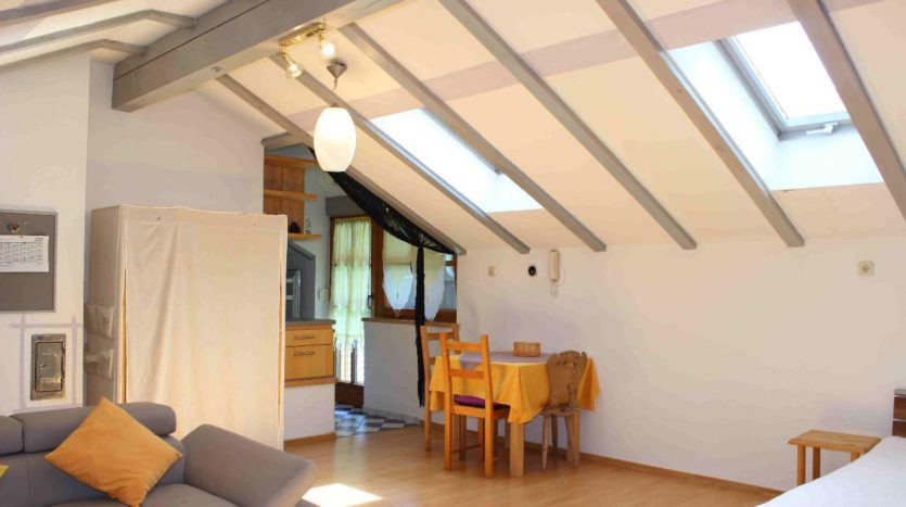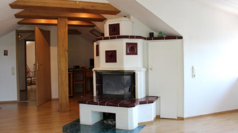Weiter im Haupthaus, das Dachgeschoss ist zusätzlich als Wohnfläche ausgebaut und genehmigt. Hier entstanden 1 Schlafraum und ein Wohnzimmer. Durch die großen Panoramafenster an der Giebelseite und die seitliche Gaube ist dieser Raum von Sonne ganztags durchflutet.