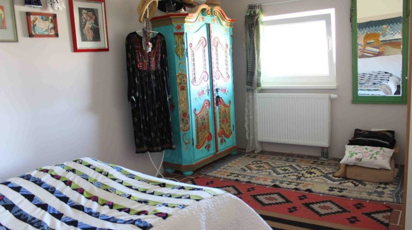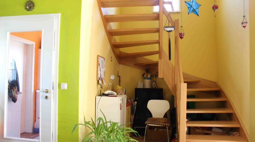 Das Obergeschoss, welches über eine moderne Holztreppe zu begehen ist besticht durch hohe Decken. Es besteht aus einem großzügigem (teilbarem) Elternschlafzimmer (inkl. Schwedenofen), ein Kinderzimmer sowie ein Badezimmer mit Wanne und bodenebener Dusche.
