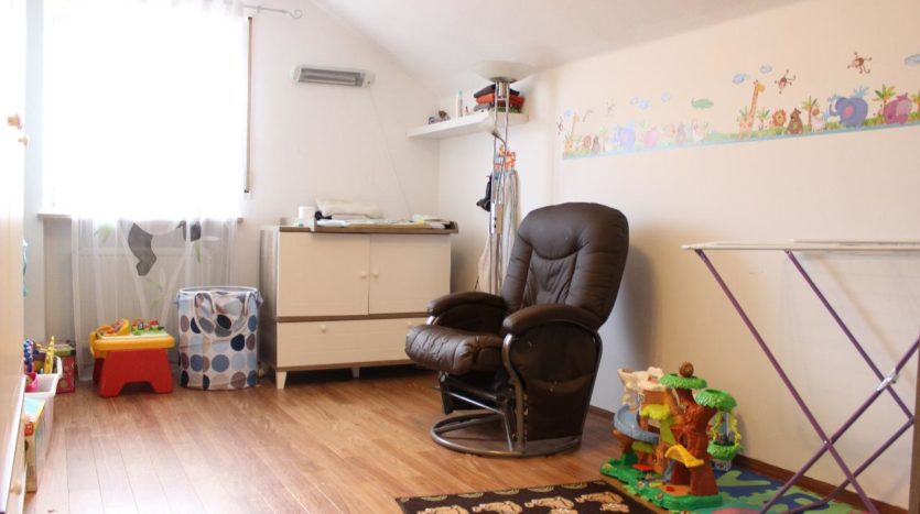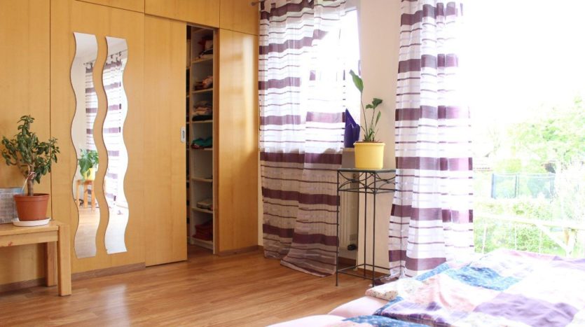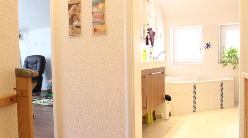 Im Obergeschoss, das ebenso mit einem vom Erdgeschoss hochwertigem Glaswindfang optisch abgegrenzt wurde, befinden sich drei Schlafzimmer sowie ein mit einer Fußbodenheizung ausgestattes Bad mit Badewanne, bodenebener Dusche sowie Waschbecken und WC. Die Böden sind aus hohwertigem PVC. Ein besonderes Highlight, dass jedes Frauenherz höher schlagen lässt, ist der begehbare Schrank im lichtdurchflutetem Elternschlafzimmer.