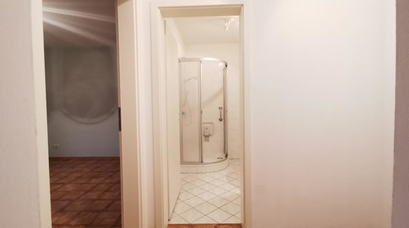 Das Bad verfügt über eine Dusche sowie Waschmaschinenanschluss. Die Küche ist mit einem Fenster ausgestattet.