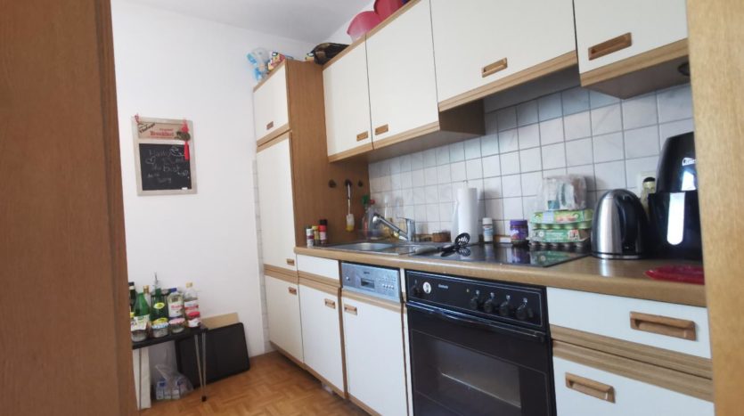 Die Einbauküche ist im Preis inklusive. Über das großzügige Wohnzimmer ist die überdachte Terrasse sowie die Garage zu begehen.