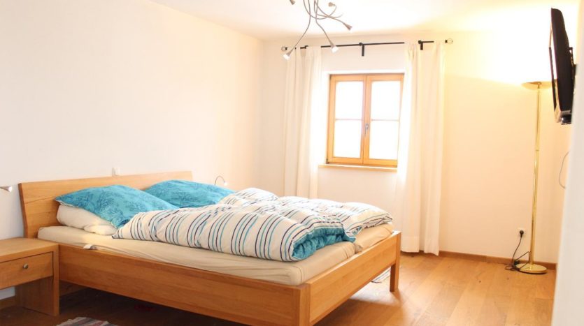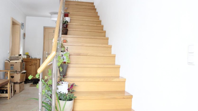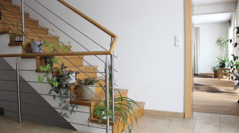 Sie betreten das erst im Jahre 2013 fertig gestellte Einfamilienhaus, und finden zu Ihrer Linken das Gäste-WC sowie eine Garderobe. Gleich rechts betritt man den Küchen-Essbereich mit einem Lohberger Festbrennstoff-Holzofen, welcher an kalten Wintertagen wohlige Wärme spendet. Die hochwertig, voll ausgestattete Einbauküche mit AEG-Einbaugeräten ist Bestandteil der Vermietung.