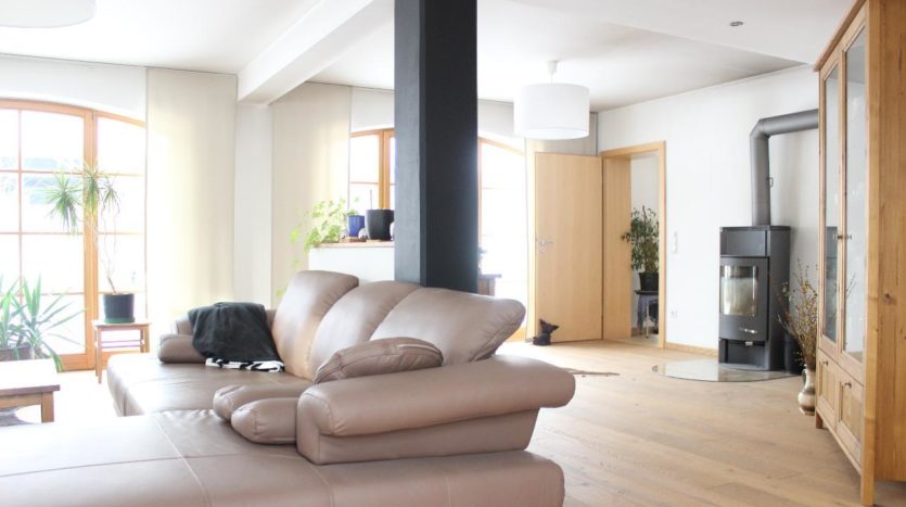 Ein Highlight im Erdgeschoss ist das ca. 45 qm große Wohnzimmer mit einem weiteren Holzofen. Schöne große Holzisolierfenster lassen den Raum förmlich in Licht erstrahlen.