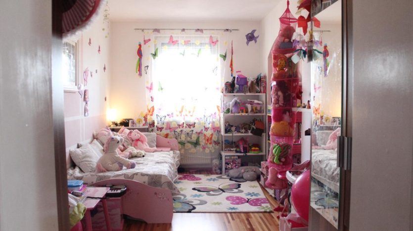 Den Flur weiter entlang finden Sie links ein großzügiges Kinderzimmer und rechts die Küche mit ausreichend Bewegungsfreiraum für alle Bewohner.